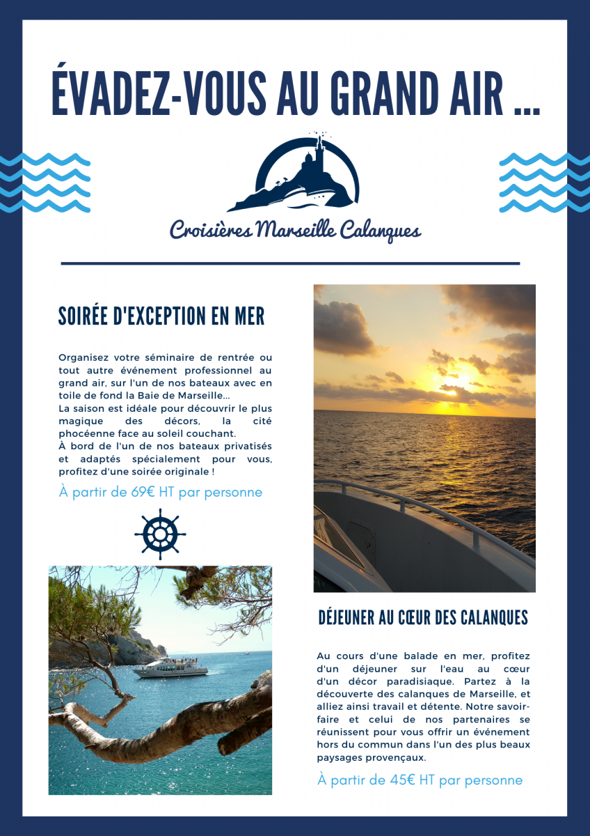 Rendez-vous client important / sortie originale entre collègues ? Nous vous amenons au cœur des paysages magnifiques du Parc National des calanques afin de déjeuner dans un cadre hors du commun.
