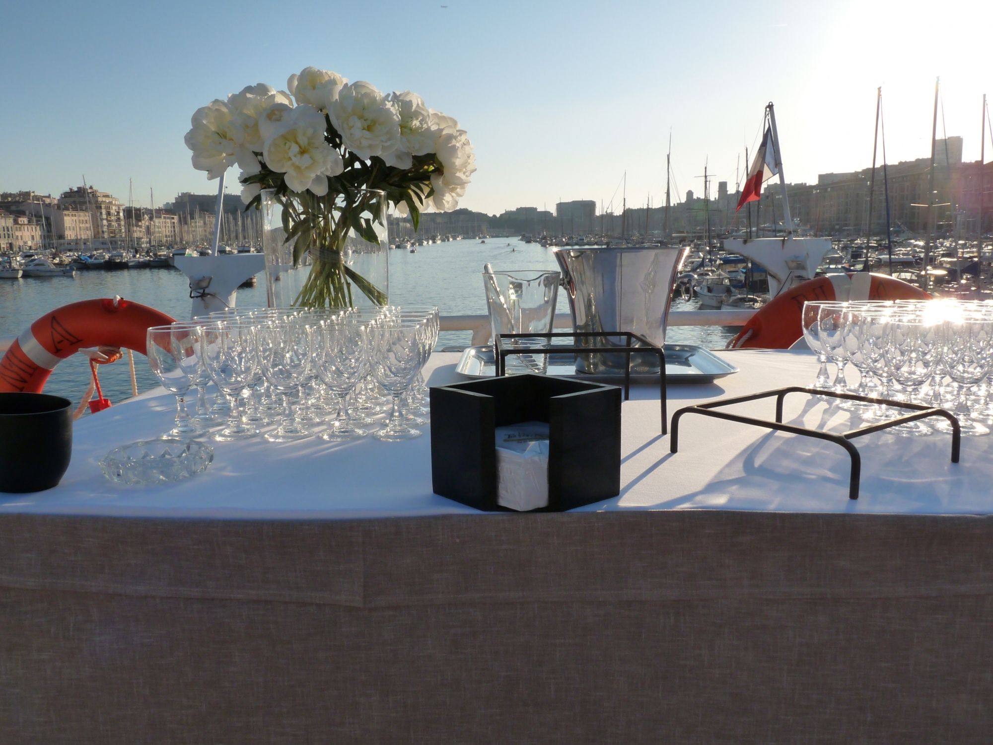 Nous organisons votre événement sur-mesure, en fonction de vos souhaits et en respectant votre budget. Tout est mis en œuvre pour vous composer une soirée d'exception et rendre l'instant unique. À bord d'un bateau privatisé, naviguez dans la Baie de Marseille et profitez d'un dîner de mariage élaboré avec soin par un traiteur de qualité.